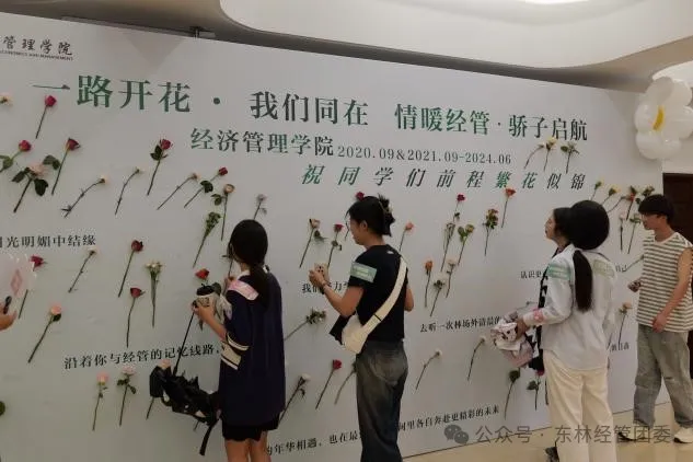 吕洁华老师和赵希勇老师为毕业生送上祝福,希望毕业生们永远心怀理想,一往无前,乘风而上,去遇见,去超越,去远方,老师们永远是坚强的后盾。之后毕业生代表为两位老师送上鲜花,充分展现了经管师生间的深厚情谊,表达了毕业生对老师四年辛勤付出的感激之情。